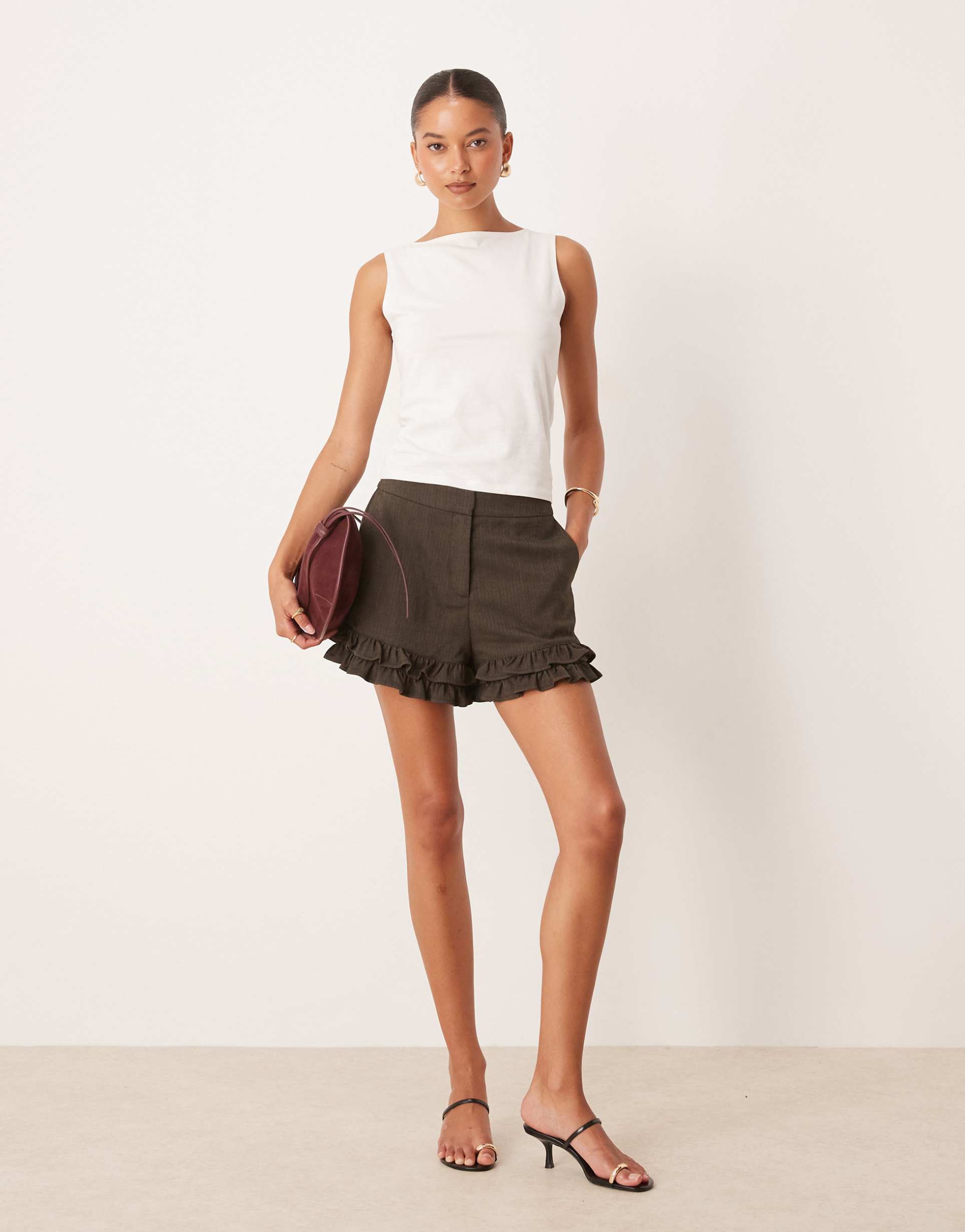 Brown Bermuda Shorts With Ruffle Trim For Work To Weekend
