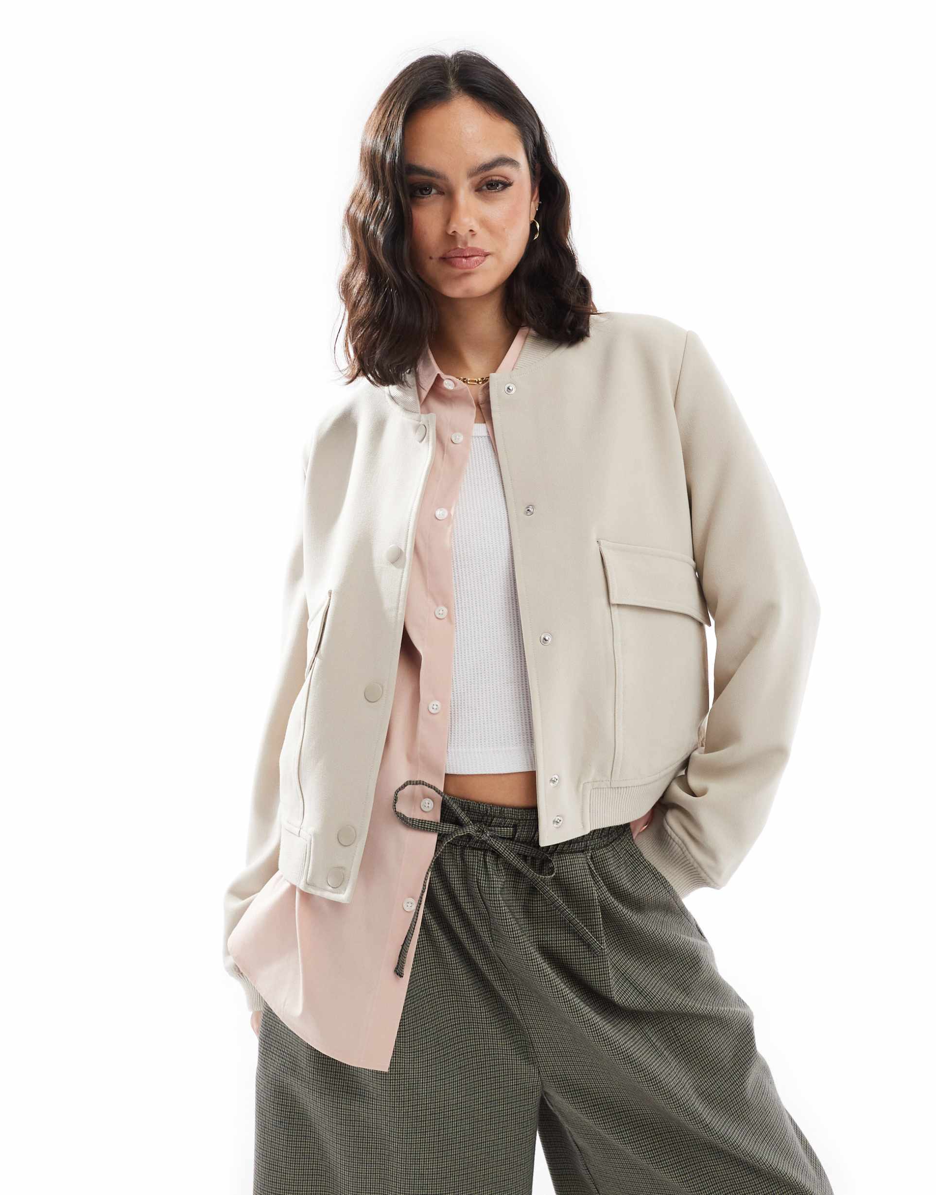 Cream Bomber Jacket With Pockets