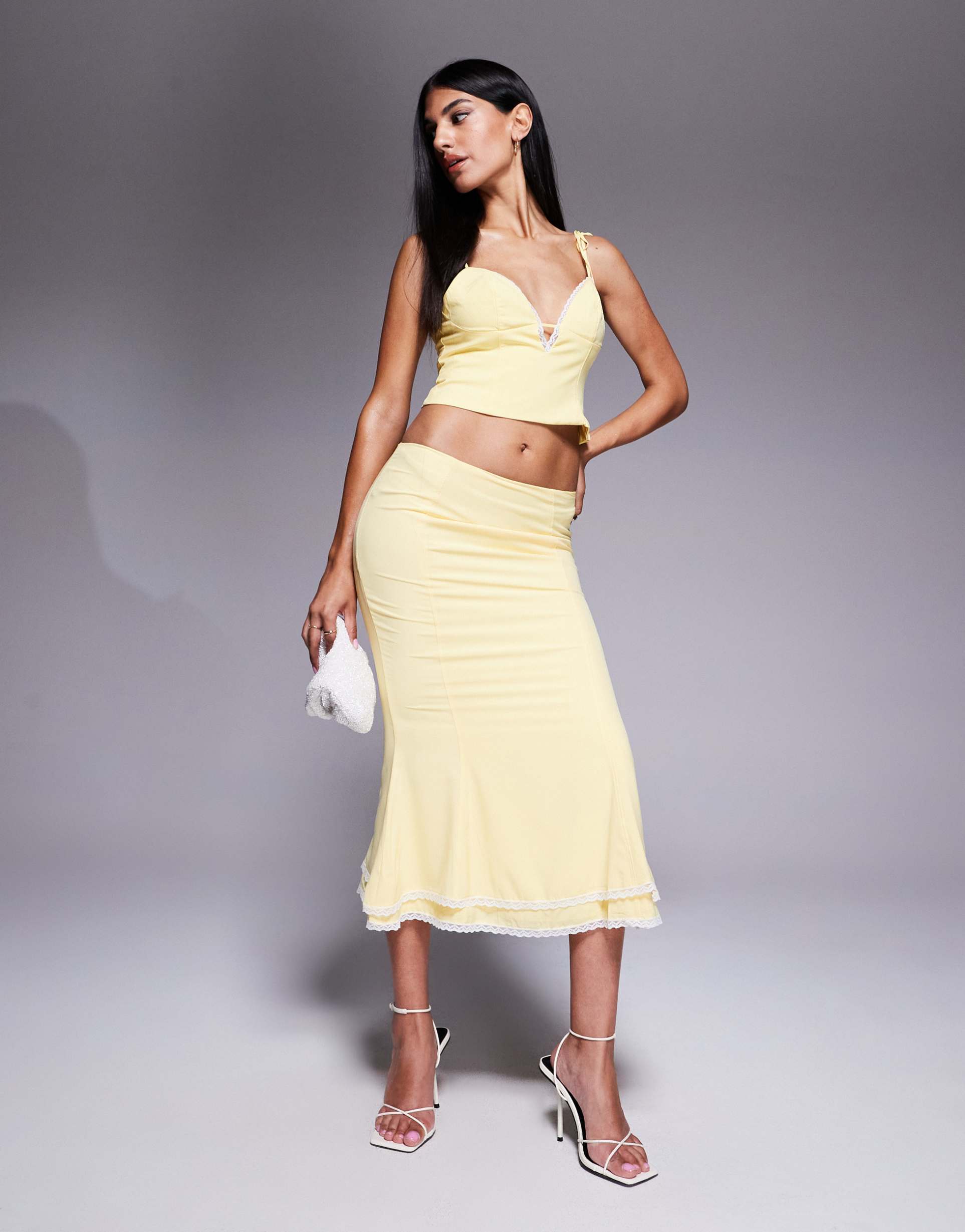 Pastel Yellow Lace Trim Tiered Midi Skirt