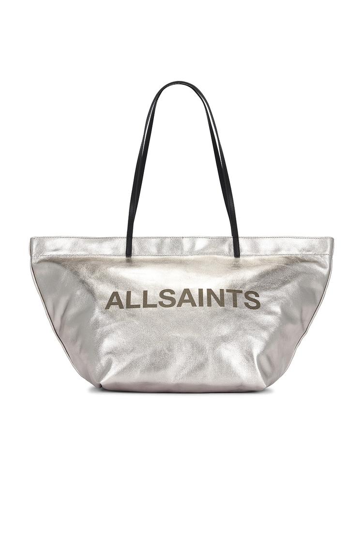 Meet your new go-to companion for everyday polish: the All Saints Serafina Canvas Tote. Metallic canvas exterior with black leather trim and silver-tone hardware creates a modern, city-ready silhouette. A secure top zip opens to one spacious main compartment with a discreet interior slip pocket, while subtle logo detailing at the front adds signature attitude. Double top handles plus a longer shoulder strap offer versatile carrying—from workday to weekend adventures. Durable, roomy, and effortlessly chic, this tote elevates simple outfits with a touch of industrial luxe and practical organization.