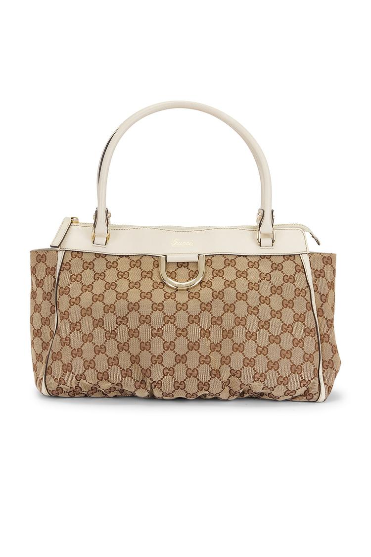 Meet the Gucci Abbey D-Ring Tote, reimagined for modern days with timeless luxury. Crafted in beige gg canvas accented by pristine white calfskin trim, this tote pairs refined elegance with everyday practicality. Silver-tone hardware glints at the zip closure and interior pockets, while the sturdy top handles and optional shoulder strap offer versatile carrying options. Inside, a roomy main compartment with a zipper pocket and slip pocket keeps essentials secure and organized. Made in Italy and finished with the iconic GG motif, this sophisticated tote elevates workwear and weekend looks alike, a true statement of refined craftsmanship.