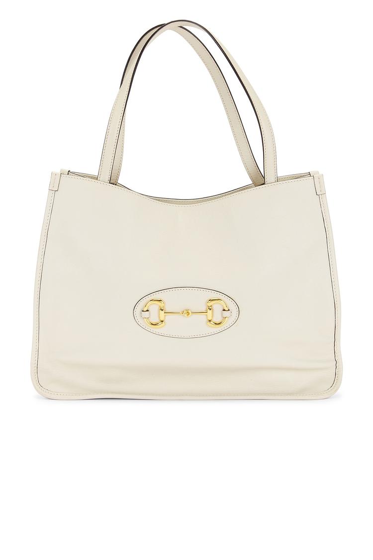 Meet the Gucci Horsebit 1955 Tote in pristine white calfskin, a timeless everyday companion. The soft, white leather forms a clean, minimalist silhouette, accented by iconic gold-tone horsebit hardware and a magnetic snap closure for seamless access. Externally sleek, the bag opens to a canvas-lined interior with a single expansive main compartment and a discreet interior pocket for essentials. Two sturdy handles and a shoulder strap offer versatile carrying—from desk to dinner. A sophisticated, Italian-made statement piece that elevates any outfit with understated luxury.
