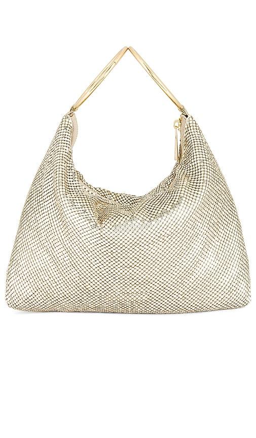 OLGA BERG SHAR MESH CONVERTIBLE BAG IN METALLIC GOLD.