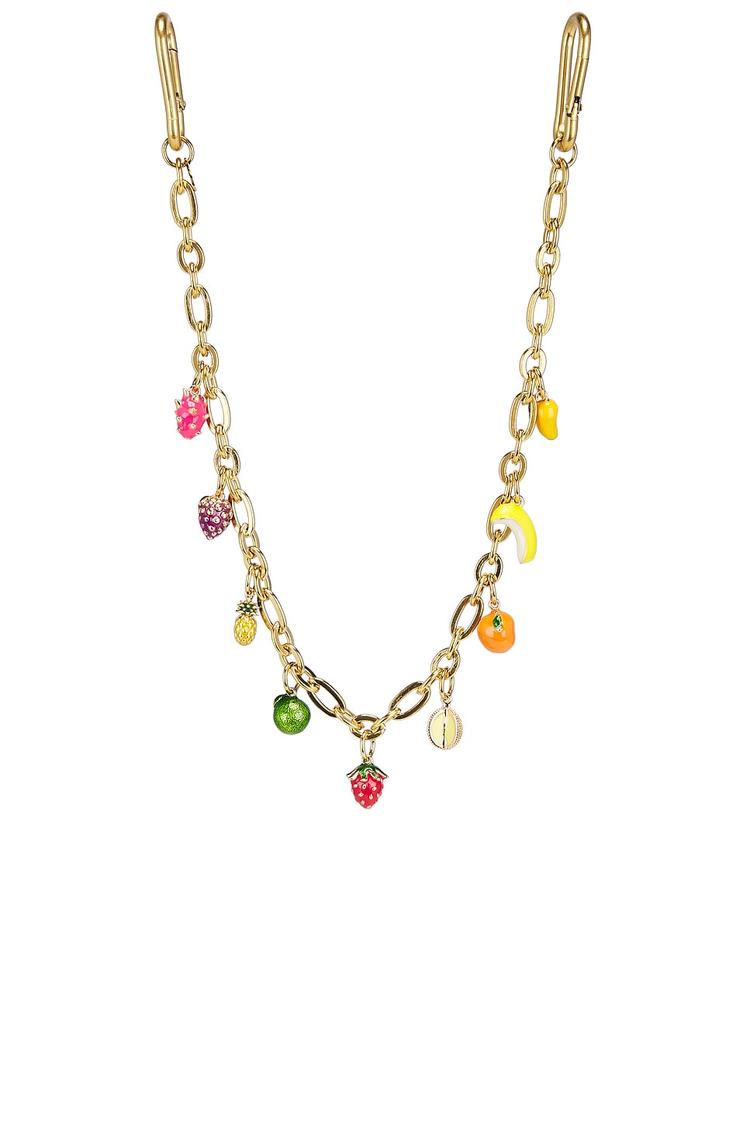 Meet a playful gold-tone bag charm that instantly brightens any tote or handbag. The delicate chain is sprinkled with multicolored fruit charms—hot pinks, greens, yellows, oranges and reds—that catch the light with every step. A practical lobster-clasp closure makes it easy to attach or detach, while the 36 cm length drapes elegantly for a touch of whimsy. Crafted in gold-tone metal, this charming accessory adds personality and polish to everyday looks, turning a simple bag into a statement piece without adding bulk.