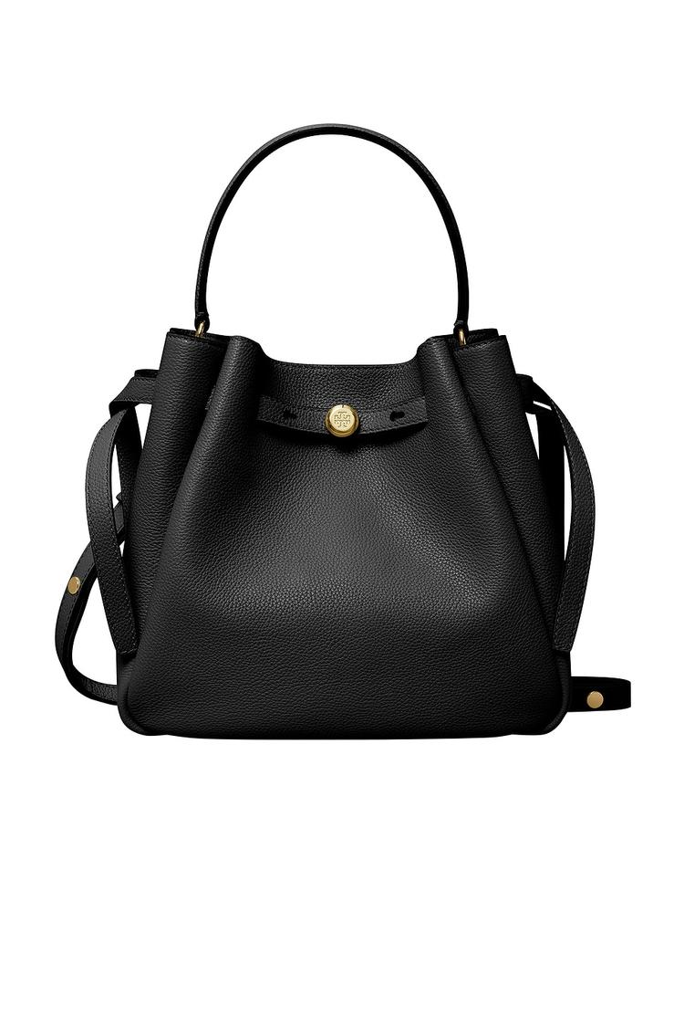 Meet your new go-to companion for effortless polish: the Tory Burch Romy Bucket Bag in black pebble leather. This structured bucket silhouette features a top handle with a detachable, adjustable leather shoulder strap for hands-free versatility. The top magnetic closure with belted collar stud keeps your essentials secure inside one main compartment with an interior slip pocket. Gold-tone hardware accents the timeless silhouette, crafted in pebbled leather with a textile lining for durability. Perfect from desk to dinner, it adds refined, modern contrast to both tailored workwear and weekend denim.