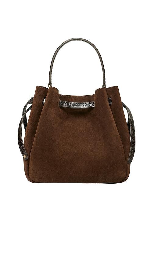 TORY BURCH ROMY SUEDE BUCKET BAG IN BROWN.
