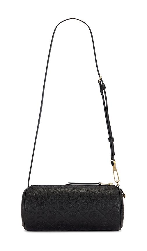 TORY BURCH T MONOGRAM PEBBLE CYLINDER BAG IN BLACK.