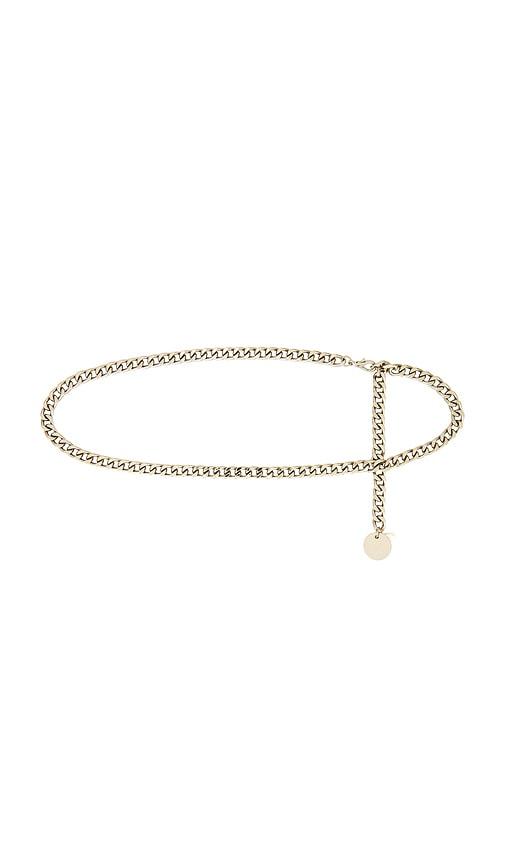 LOVESTRENGTH EVERYWHERE CHAIN BELT IN METALLIC SILVER.