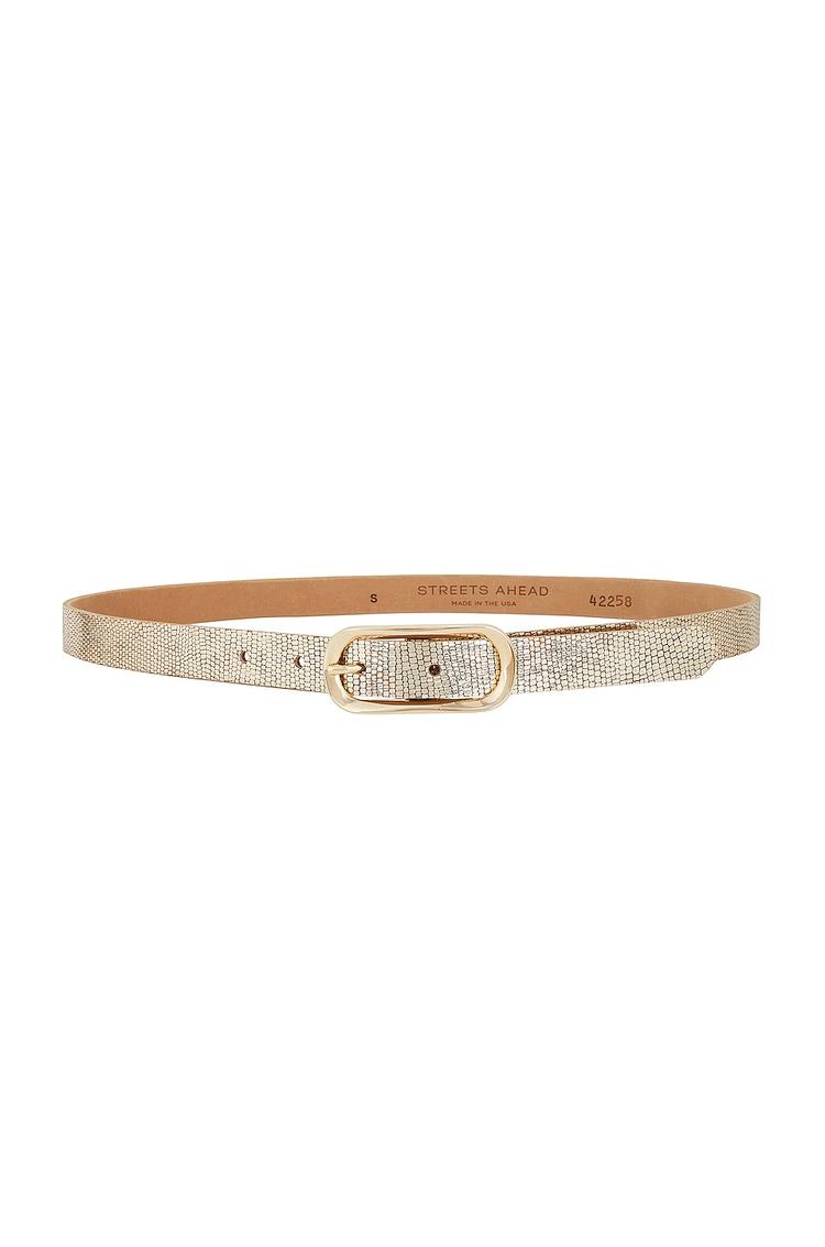 Elevate everyday outfits with the Streets Ahead Aurelle Belt—a refined, beige genuine leather belt punctuated by gold-tone hardware. This slender 2 cm belt cinches at the waist to sculpt a clean silhouette, with a length of approximately 82–90 cm in size S. Made in the USA, it features a classic frame-style buckle and a subtle woven texture that gleams in the light. Perfect for pairing with denim for a casual-cool look or looping over a pencil skirt for smarter ensembles, this belt delivers timeless polish and versatile everyday luxury.
