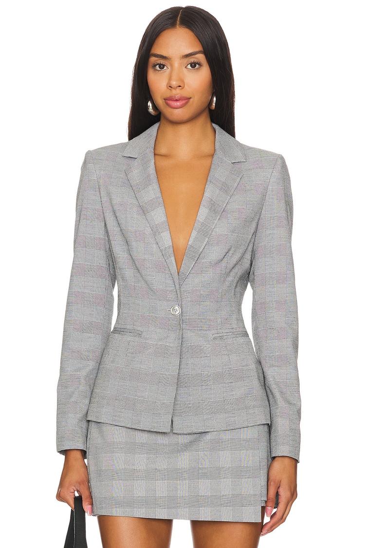 This tailored single-breasted blazer features a classic notch lapel and padded shoulders that create a sharp silhouette. Crafted from a plaid twill fabric in shades of gray, black, and white, it offers a sophisticated hip-length cut with long regular sleeves and buttoned cuffs. The vented back enhances mobility, while front button closure and functional pockets add to its practicality. Ideal for workwear, business casual settings, and conferences, this minimalist and business chic blazer embodies timeless style and structured elegance.