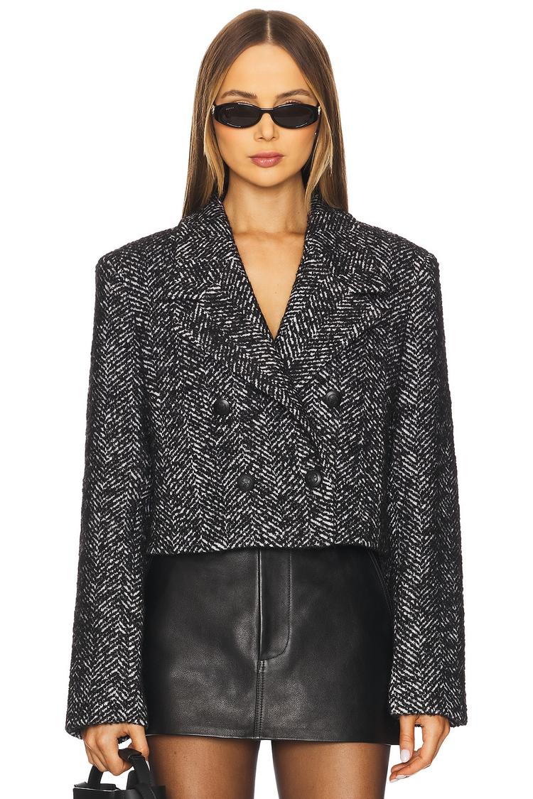 This Vienna blazer features a tailored, single-breasted silhouette with a waist-length cut perfect for layering in autumn and winter. Crafted from heavyweight wool blend tweed fabric with a striking black and white herringbone pattern, it has padded shoulders and a classic notch lapel collar for a sophisticated finish. The blazer closes with front buttons and is fully lined in viscose and polyester for comfort. Its long regular sleeves and covered back create a clean, minimalist look ideal for casual, workwear, and business casual occasions.
