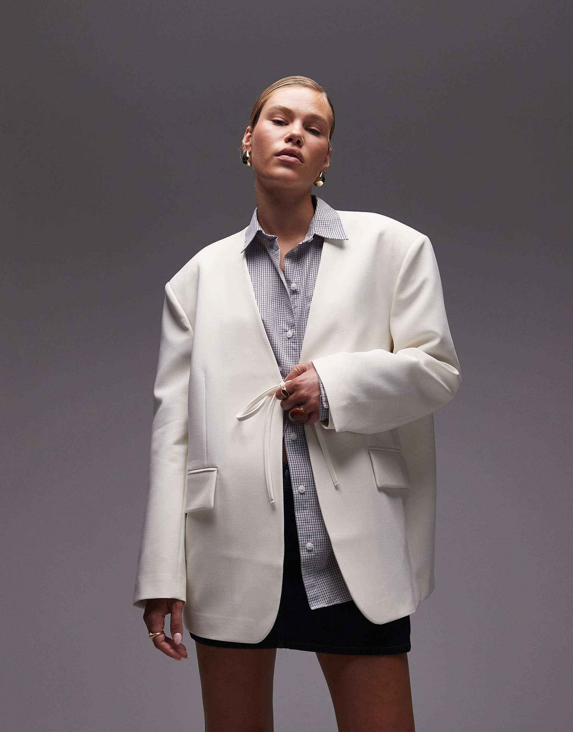 ASOS DESIGN COLLARLESS OVERSIZED TIE FRONT BLAZER IN CREAM