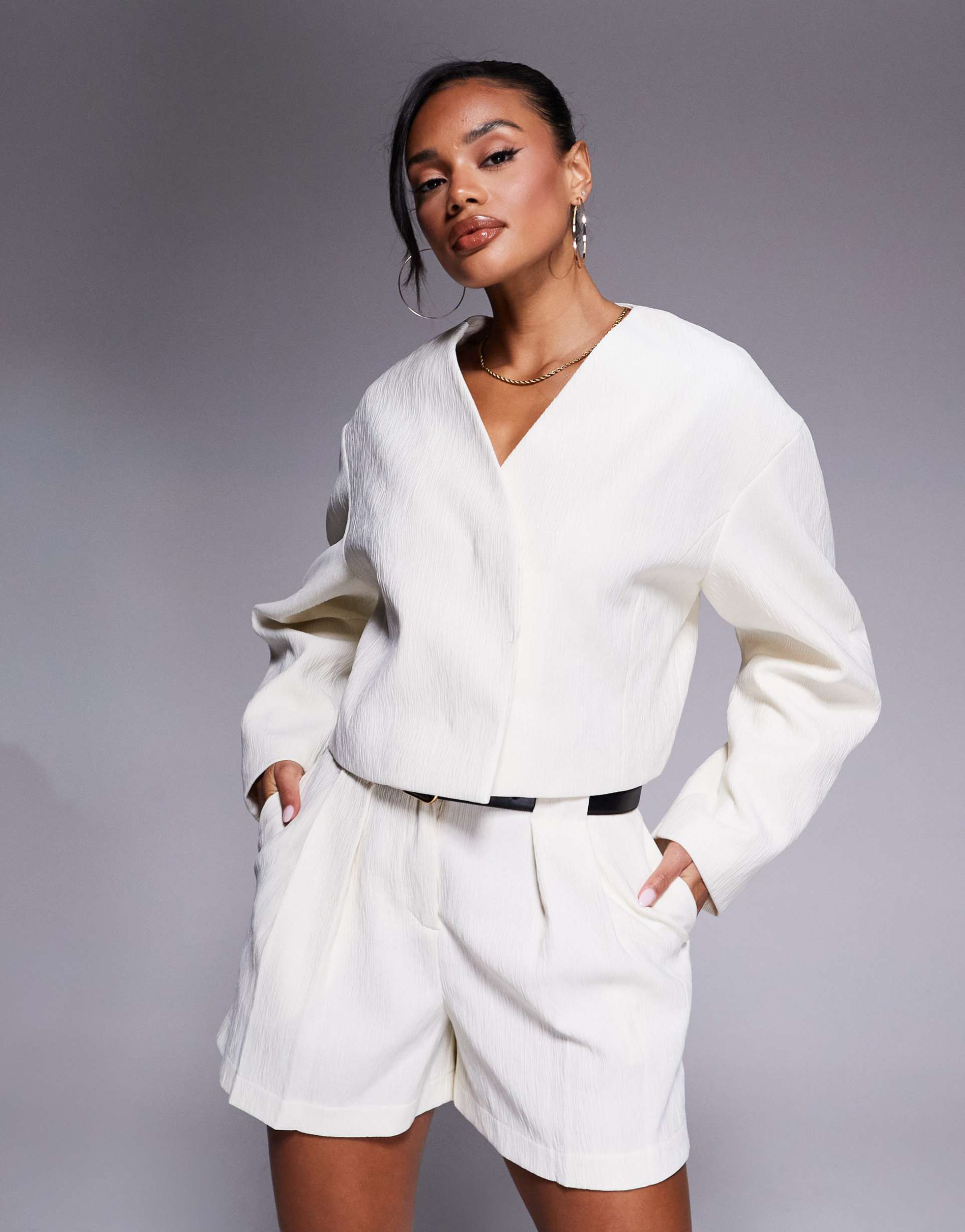 ASOS DESIGN CROPPED TEXTURED BLAZER IN CREAM - PART OF A SET