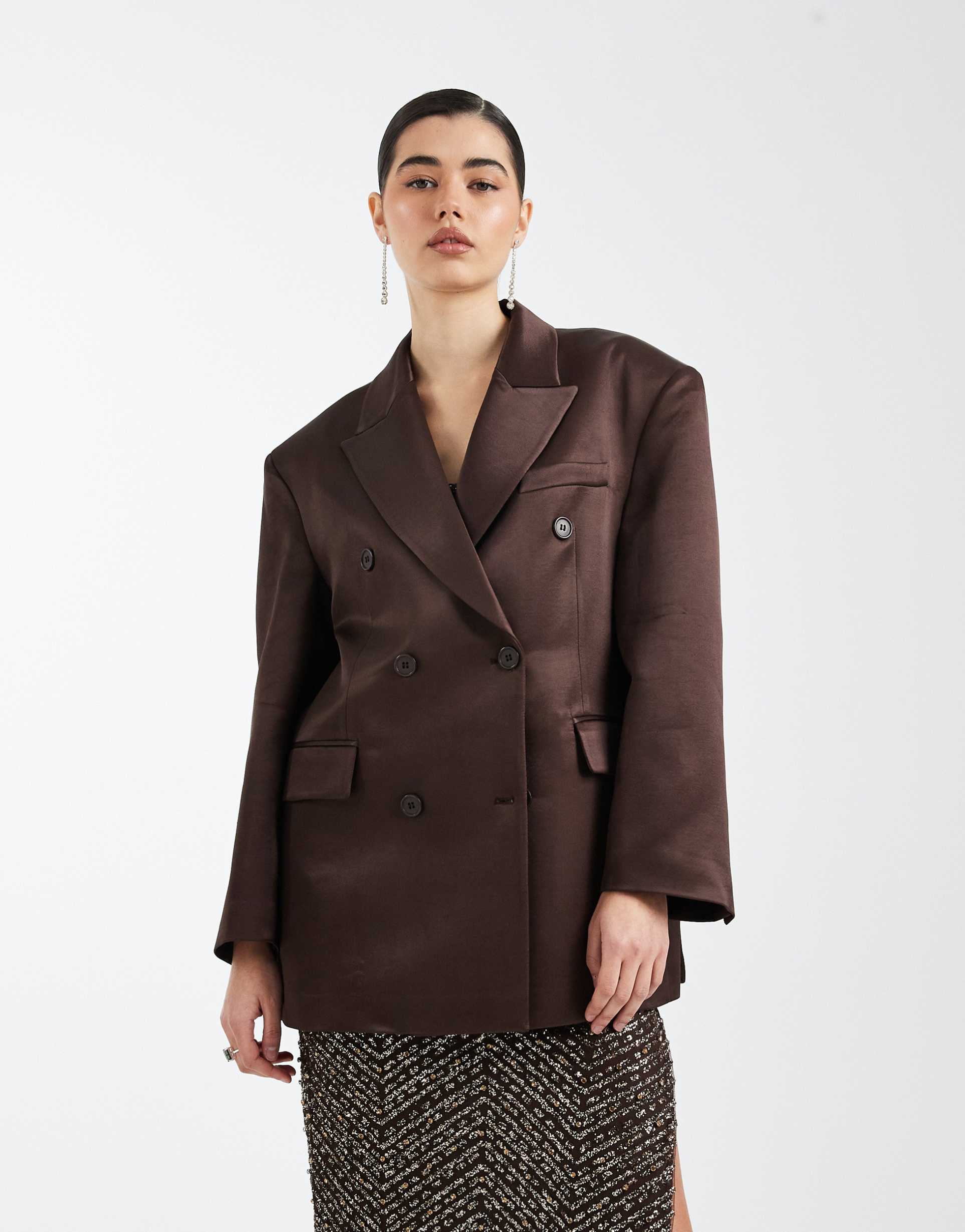 ASOS DESIGN OVERSIZED DOUBLE BREASTED SATIN BLAZER IN CHOCOLATE BROWN