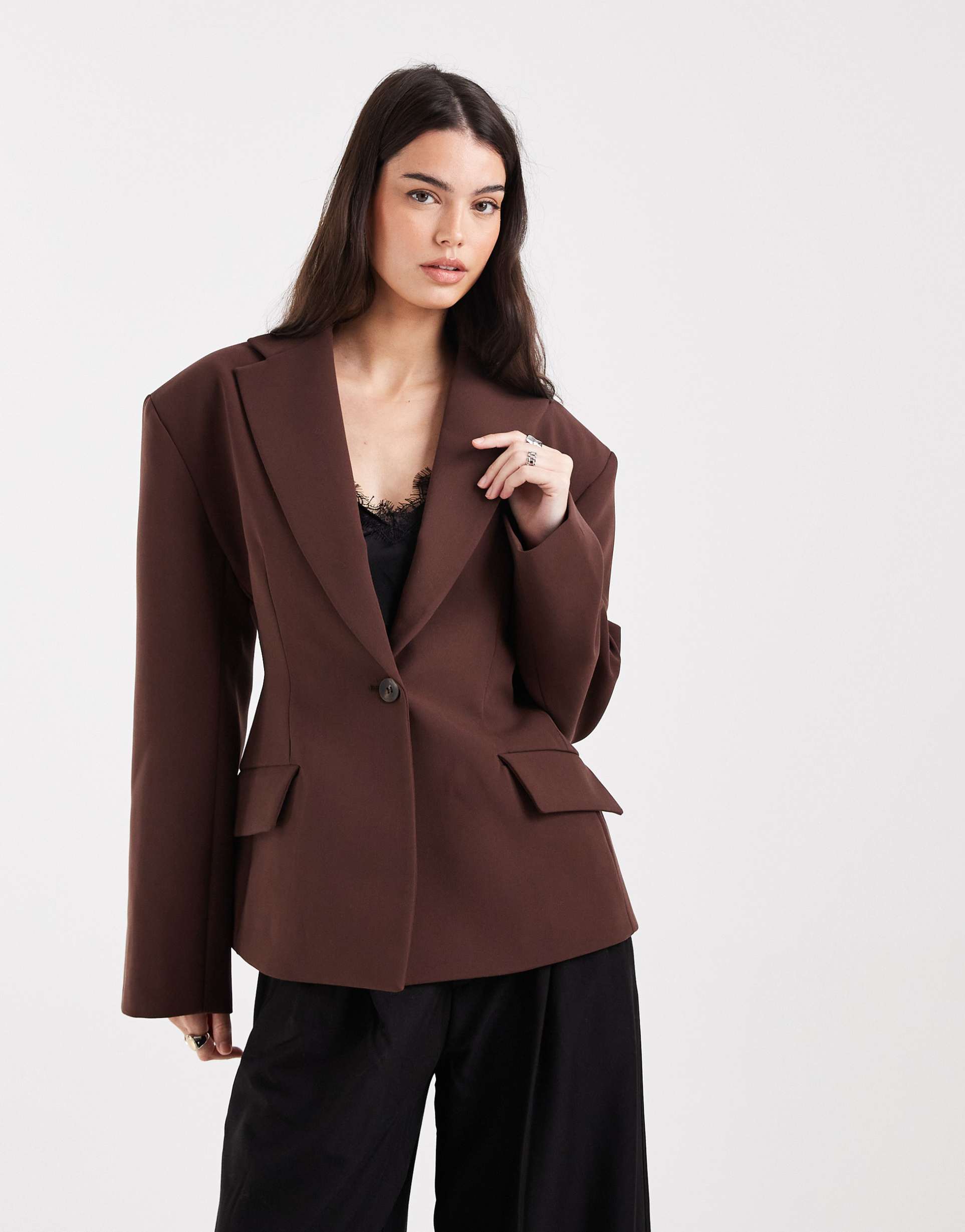 This ASOS DESIGN sculpt cinch waist blazer in mocha features classic notch lapels and padded shoulders for structured elegance. Tailored with a single front button fastening and a cinched waist, it offers a regular fit that flatters the silhouette. Made from a plain-woven blend of polyester, viscose, and elastane, this hip-length blazer is perfect for workwear, business casual settings, and conferences. Its solid matte brown color and clean lines make it a sophisticated addition to any wardrobe.