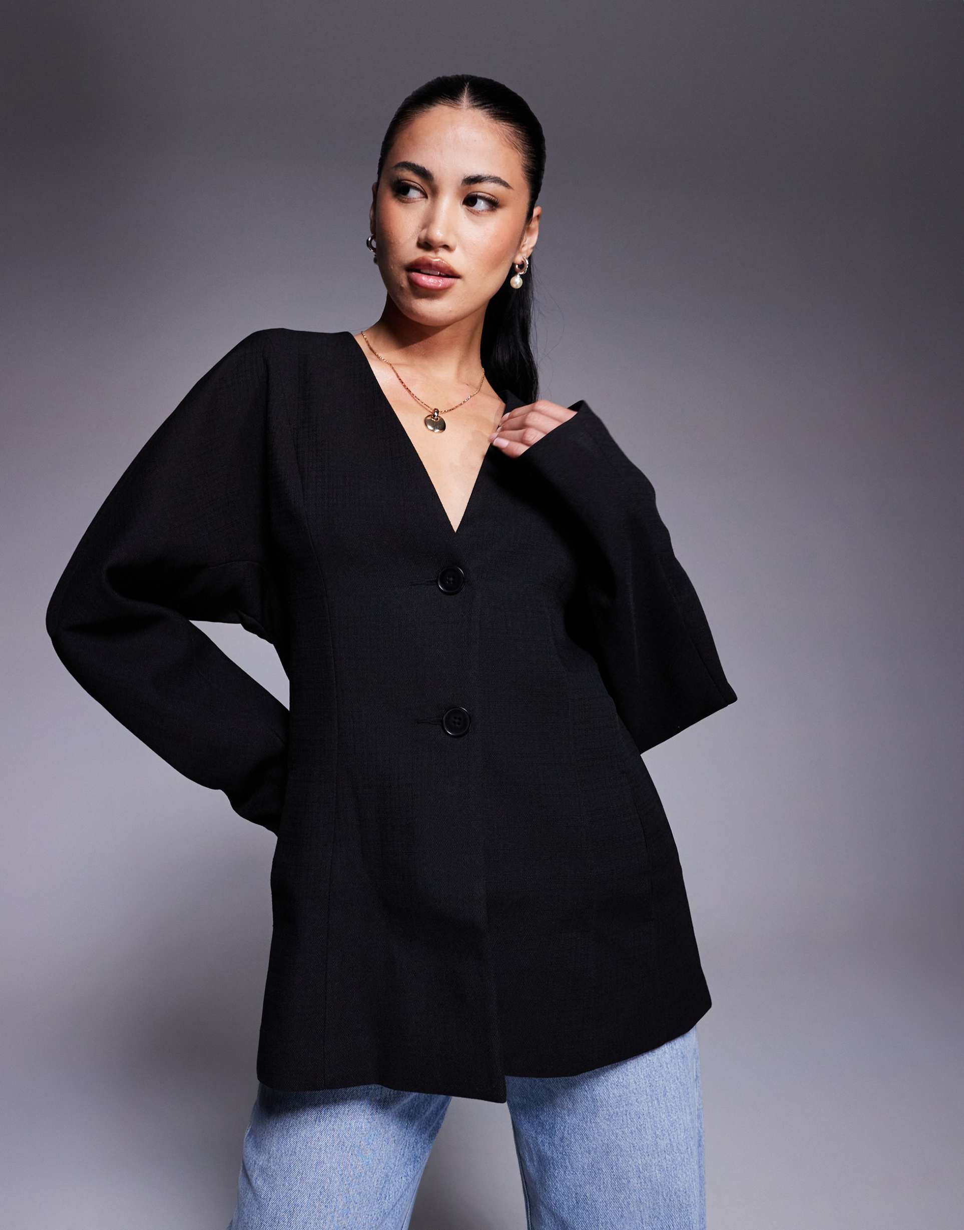 ASOS DESIGN TAILORED LINEN LOOK TEXTURED NIPPED WAIST BLAZER IN BLACK - PART OF A SET