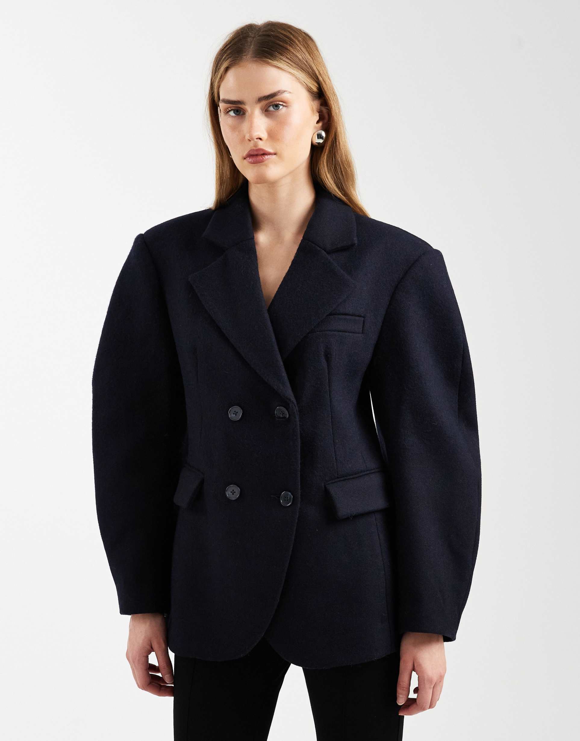 classic navy blazer with cocoon sleeves