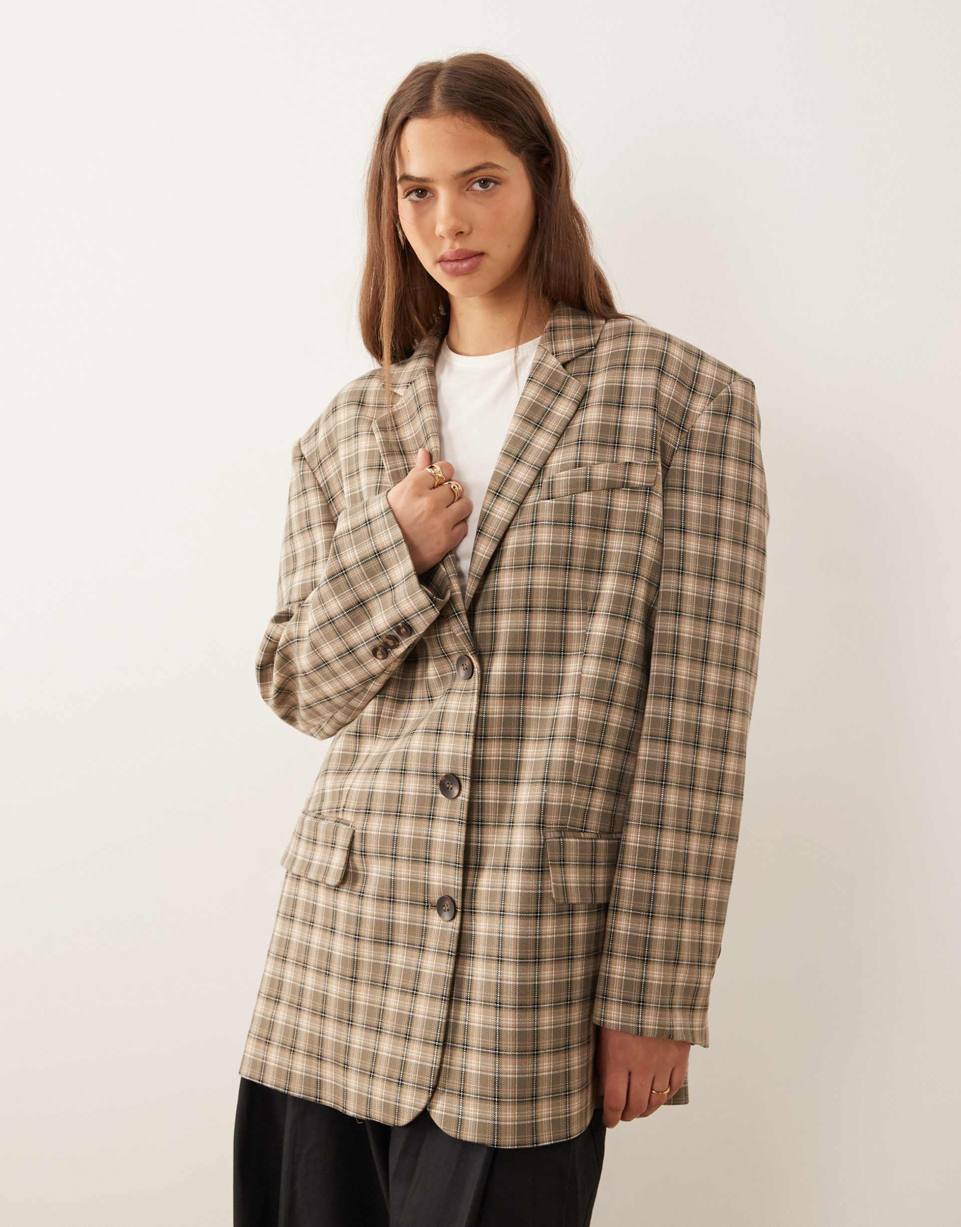 This ASOS DESIGN oversized single-breasted blazer features a hip-length silhouette with a relaxed fit, crafted in a textured woven fabric blend of polyester, viscose, and elastane. Its classic notch lapels and padded shoulders add structured elegance, complemented by a two-button front closure and vented back for ease of movement. The blazer showcases an all-over checkered pattern in muted beige, dark brown, and gray tones, ideal for casual, workwear, or business casual occasions. Pocket details and subtle epaulettes on the shoulders complete this timeless piece, perfect for layering through autumn to spring seasons.