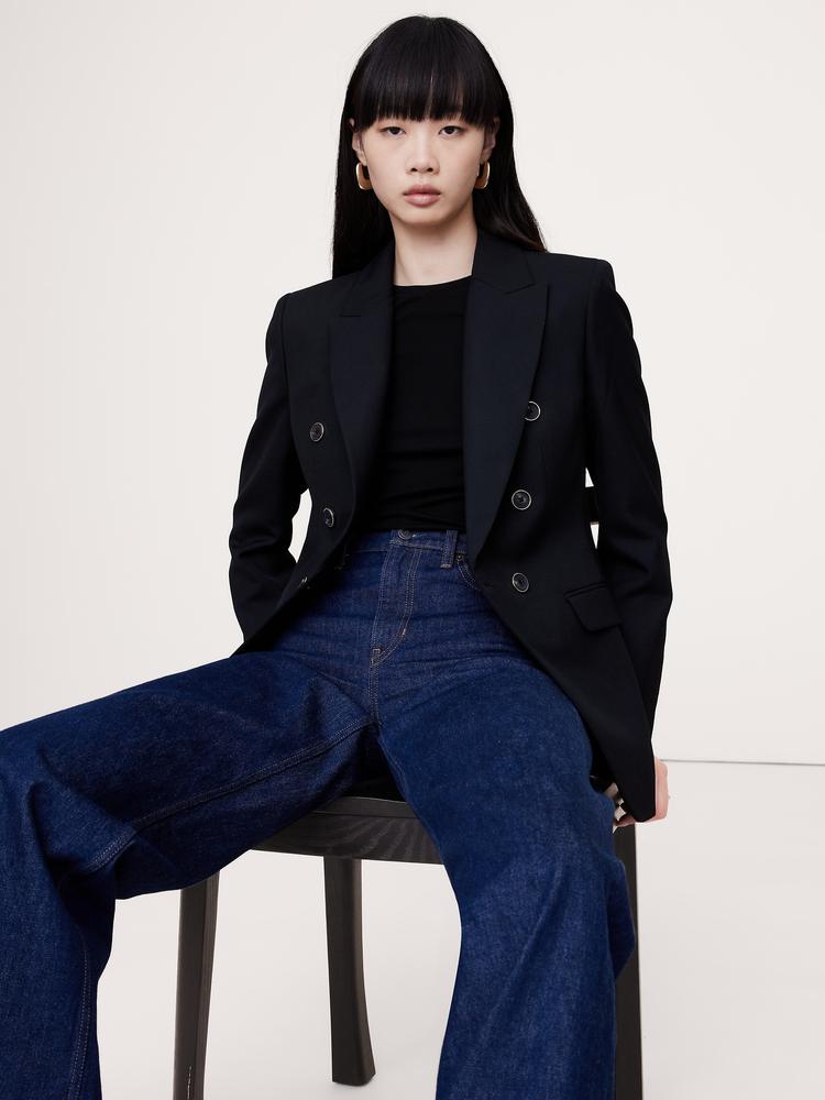 Expertly tailored from a beautiful wool-blend twill, this double-breasted blazer is cut for a slim fit with sharp shoulders. Here, we refreshed the style with horn buttons with a delicate gold frame—a nod to the style's maritime heritage.Slim Fit: Sharp shoulders, slim through the sleeves and body with special definition at the waist.Peak lapel. Double-breasted gold crest button front.Two exterior pockets.Single back vent.Fully lined.*This style runs small. Consider sizing up.#539480