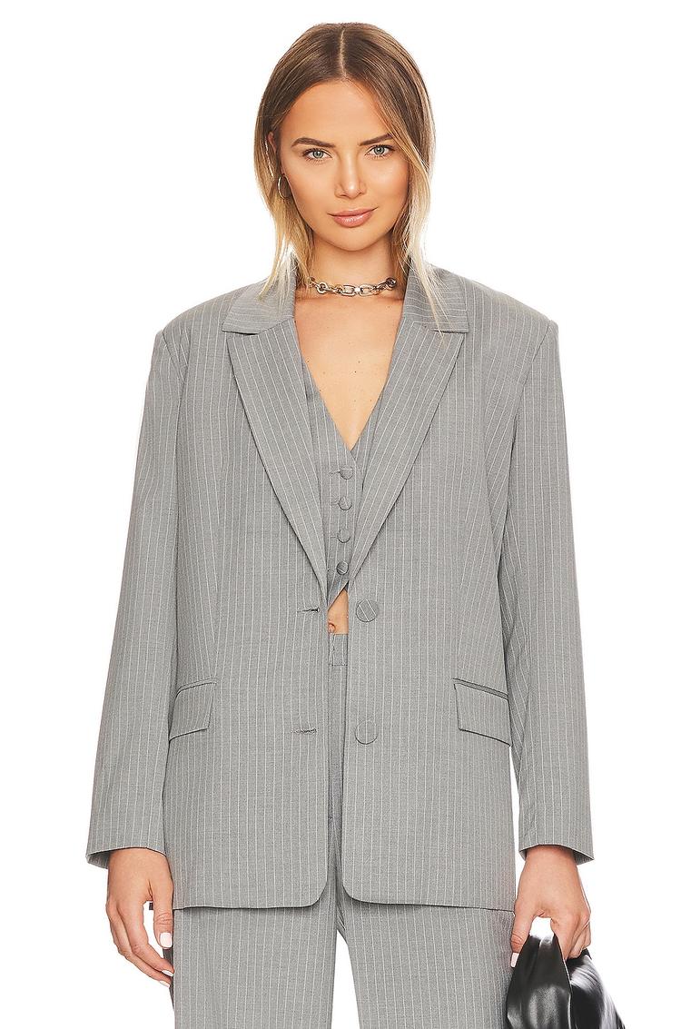 This tailored single-breasted blazer features a classic notch lapel and long sleeves, crafted from a suiting blend of polyester and viscose with a smooth polyester lining. Its hip-length silhouette is enhanced by subtle pin stripes all over, lending a sophisticated business chic vibe. Padded shoulders add structure, while front flap pockets provide practical functionality. Perfect for workwear, business casual events, and conferences, this versatile gray blazer offers polished style with comfortable tailored fit for autumn, winter, and spring seasons.