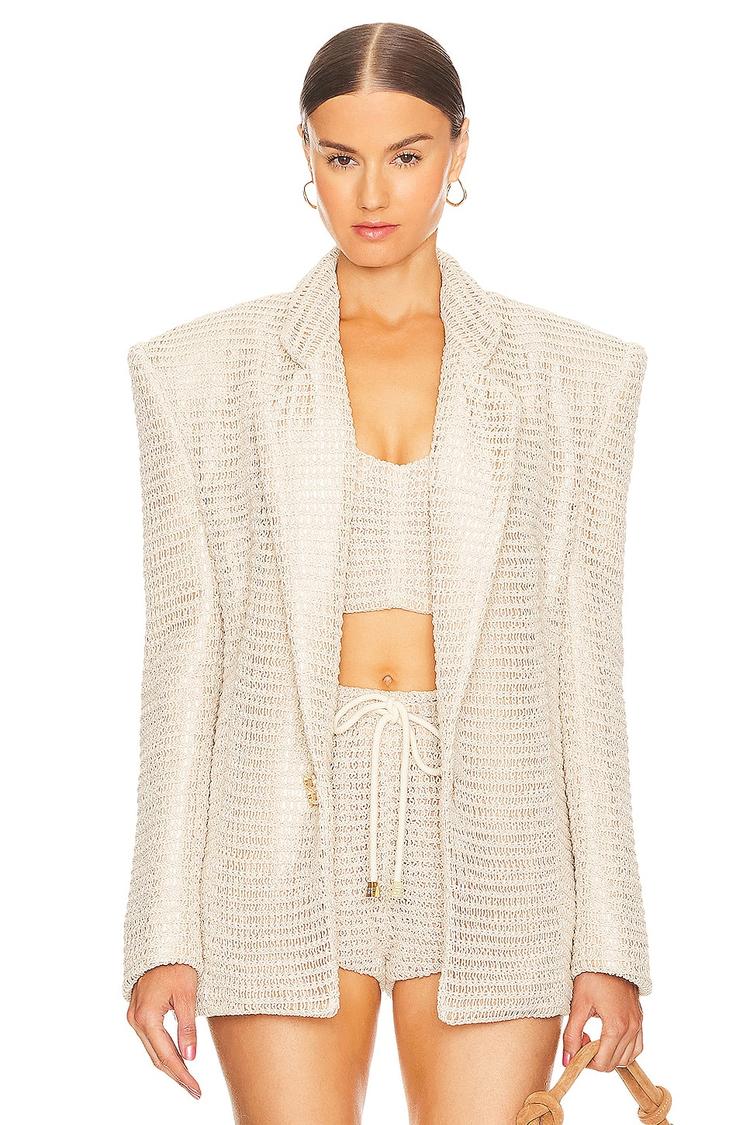 This single-breasted blazer features a tailored fit with a hip-length silhouette, crafted from a cotton blend fabric with a delicate crochet overlay adding textured sophistication. The off-white shade enhances its classic and modern appeal, complemented by long drop-shoulder sleeves and a notched lapel collar. Padded shoulders provide structure and elevate its chic design. Ideal for casual days, workwear, and business casual settings, this blazer offers a refined yet versatile option for spring through autumn seasons, combining comfort with polished style.
