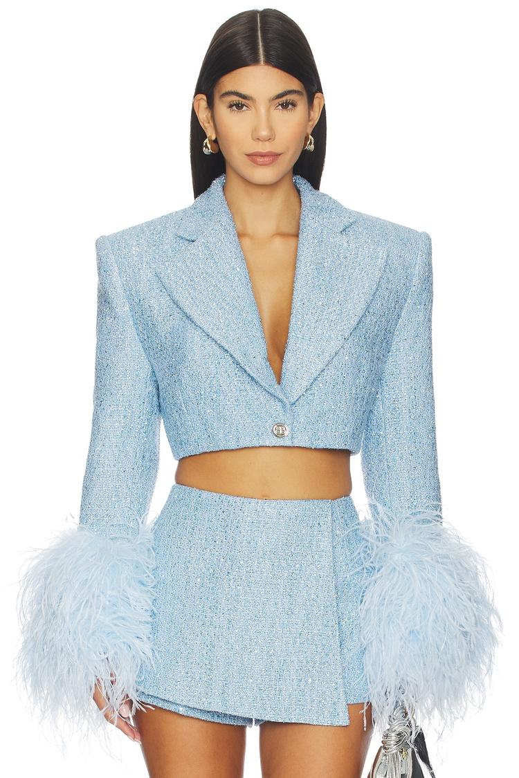 This cropped blazer features a fitted silhouette crafted from heavyweight tweed fabric in a light blue hue. It has a notched lapel collar, long regular sleeves with dramatic ostrich feather trim at the cuffs, and padded shoulders for structure. The front is secured with a silver-tone snap button closure. Fully lined with polyester and silk for comfort, this elegant and sophisticated piece is perfect for cocktail events, formal occasions, and stylish night outs during autumn, winter, and spring seasons.