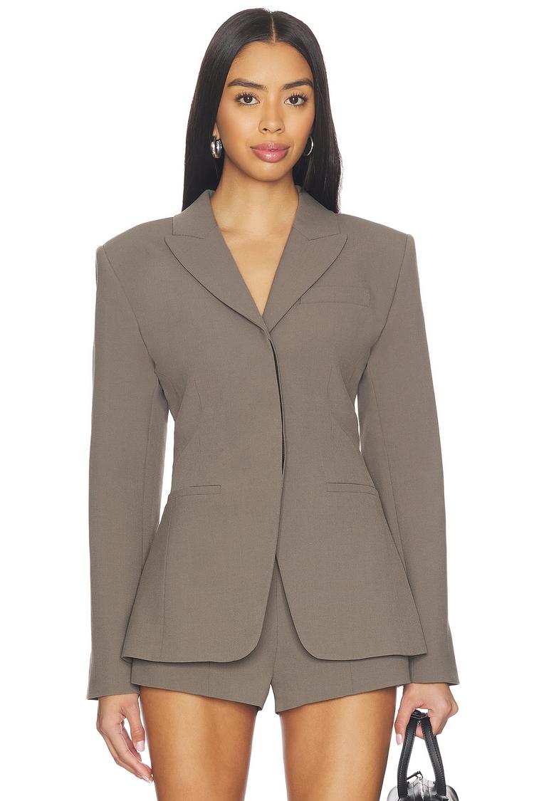 This tailored single-breasted blazer in matte khaki gabardine fabric features a cinched waist for a flattering silhouette. Designed with long regular sleeves and a classic notch lapel collar, it fastens with a front button closure. The hip-length cut and covered back style provide a polished, sophisticated look ideal for workwear, business casual, and conferences. Made from a polyester-viscose blend, this blazer combines structure with comfort for transitional seasons like autumn, winter, and spring.