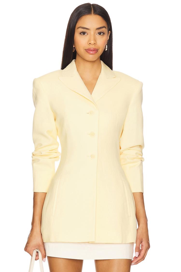 This tailored single-breasted blazer in a soft cream hue features a classic notch lapel and long regular sleeves, offering a polished silhouette that hits at the hip. Crafted from a midweight linen-blend fabric with viscose and polyester lining, it ensures comfort and structure. The blazer includes shoulder padding with subtle epaulettes for a refined touch, and faux side pockets add sleek practicality. Perfect for workwear, business casual events, or cocktail occasions, this elegant blazer balances sophistication with versatile styling for spring through autumn seasons.