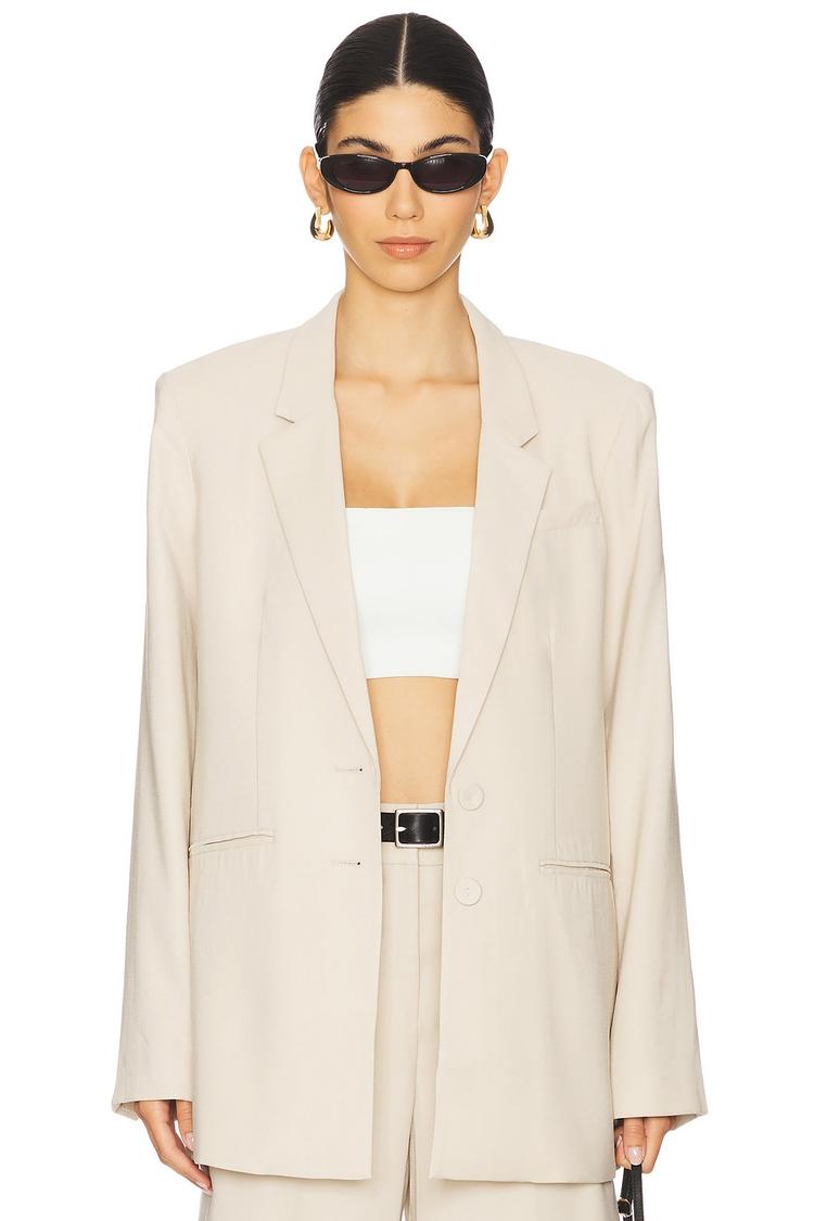 This tailored single-breasted blazer features a classic notch lapel collar and long regular sleeves, crafted from a midweight twill fabric blend of rayon, polyester, and spandex. The hip-length silhouette is enhanced with padded shoulders for a structured and sophisticated fit. The blazer closes with front buttons and includes subtle breast and faux welt pockets, making it ideal for workwear, business casual, and conference occasions. Its solid beige tone and smooth polyester-elastane lining ensure both comfort and timeless style for all weather seasons.