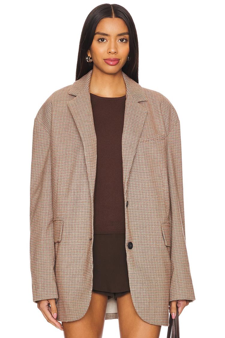 This single-breasted Reggie blazer features a relaxed fit and hip-length cut, crafted from heavyweight twill polyester-viscose fabric with a classic beige checkered pattern. The blazer is detailed with notched lapels, long regular sleeves, and front button closure, complemented by functional faux flap pockets. Fully lined with polyester and viscose, it offers a smooth interior finish. Perfect for casual, workwear, and business casual occasions, this timeless piece blends classic style with modern comfort for versatile seasonal wear in autumn, winter, and spring.