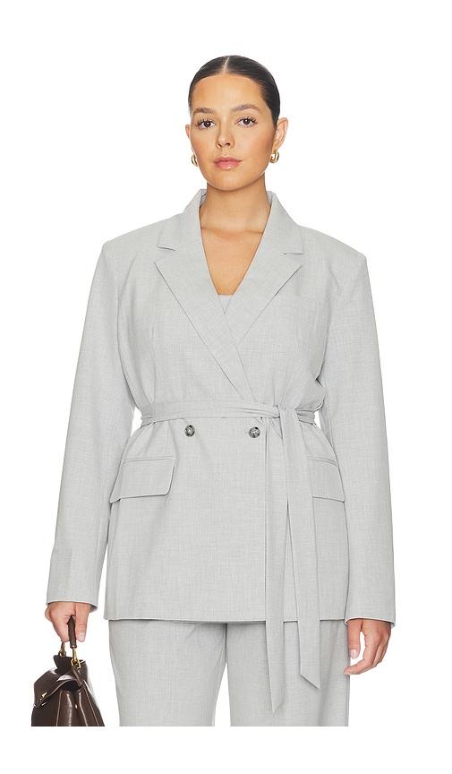 GOOD AMERICAN ESSENTIAL SUITING BELTED BLAZER IN LIGHT GREY.