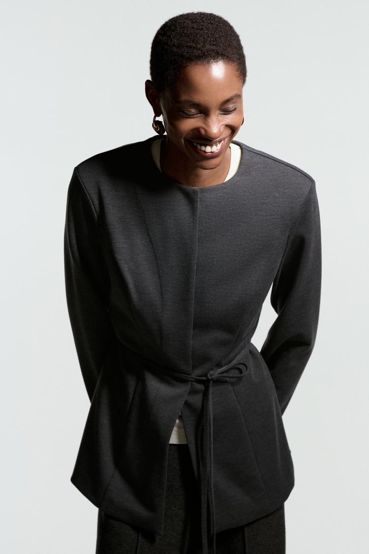 This tailored single-breasted ponte blazer features a sleek round neckline and long regular sleeves, finishing at hip length for versatile styling. Crafted from a structured ponte fabric with a matte finish, it includes a belted closure that cinches the waist, enhancing a sophisticated silhouette. The blazer’s minimalist design and covered back make it perfect for workwear, business casual settings, and conferences during transitional seasons. Its adjustable waist belt adds a functional and flattering detail, creating a polished look that pairs effortlessly with tailored trousers or skirts.