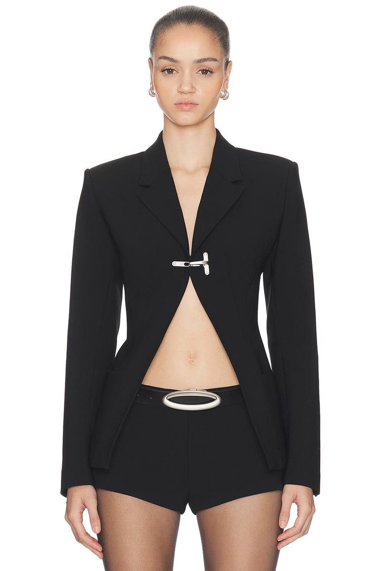 This tailored single-breasted blazer in black wool features a dramatic cutaway silhouette that accentuates the waist for a modern, sophisticated look. It has long regular sleeves with buttoned cuffs and a classic notch lapel collar. The hip-length cut, structured shoulders with pads, and hook-and-eye closure create a sharp, elegant profile. Deep side seam pockets add practical functionality. Ideal for workwear, business casual, and conference settings, this matte-finish blazer redefines classic tailoring with a contemporary edge.