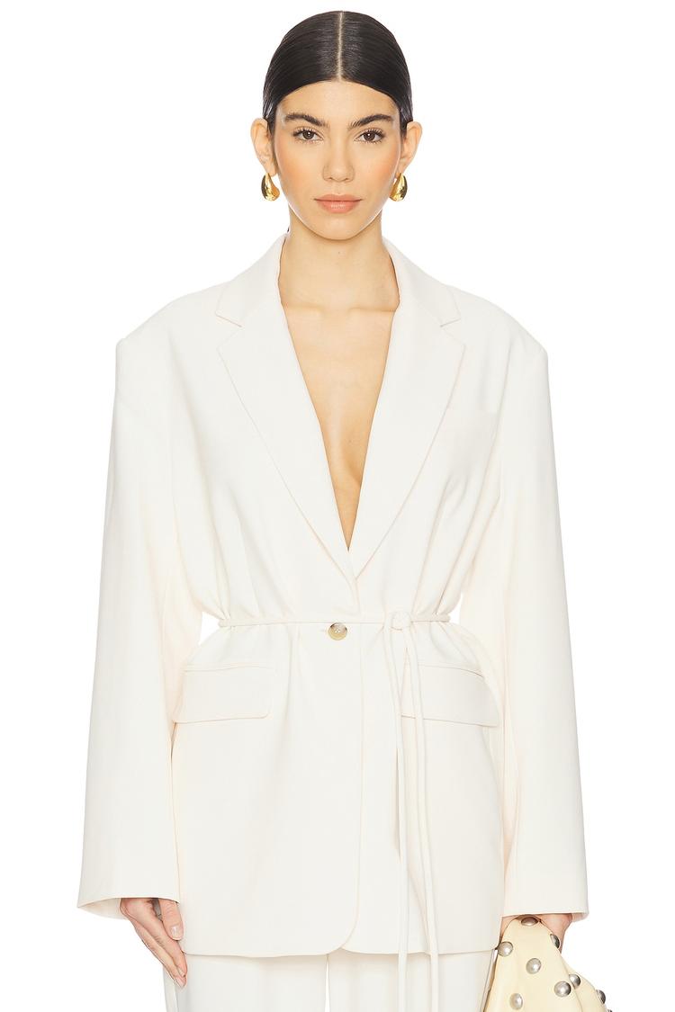 This tailored single-breasted blazer in a soft off-white crepe fabric embodies minimalist sophistication. Featuring a notch lapel collar and long regular sleeves, it hits at hip length for versatile styling. The midweight crepe offers a matte finish with subtle shoulder padding for structure, while a removable waist tie adds an adjustable waist fit. Functional front button closure and flap pockets enhance its polished look. Lined with smooth polyester, this blazer is perfect for business casual settings, workwear, or brunch occasions where refined simplicity is key.