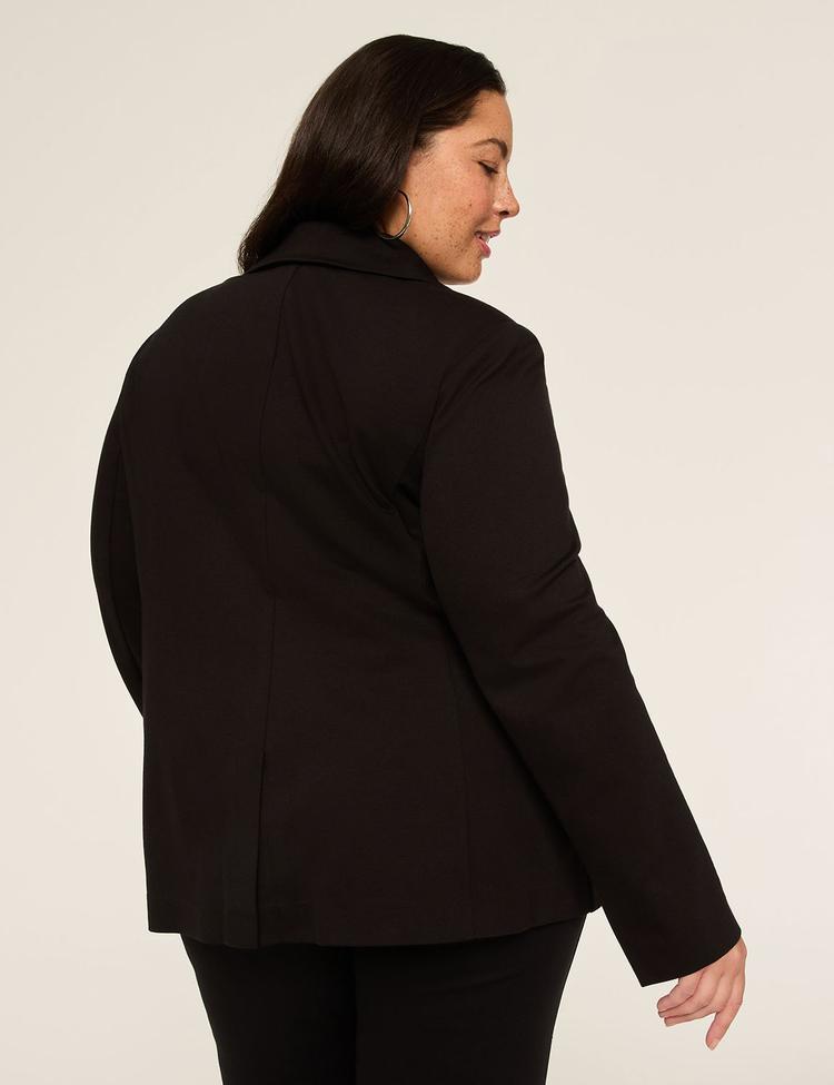 This plus size single-breasted blazer in classic black features a smooth ponte knit fabric blend of rayon, nylon, and elastane, delivering a structured yet stretchy fit. Designed with a notch lapel collar adorned with shimmering rhinestone embellishments and functional front pockets that are also decorated with rhinestones, it showcases a hip-length cut with long regular sleeves. The blazer has a vented back and closes with a single button, providing a tailored and elegant silhouette perfect for workwear, business casual events, and conferences. Fully lined with polyester for comfort and durability.