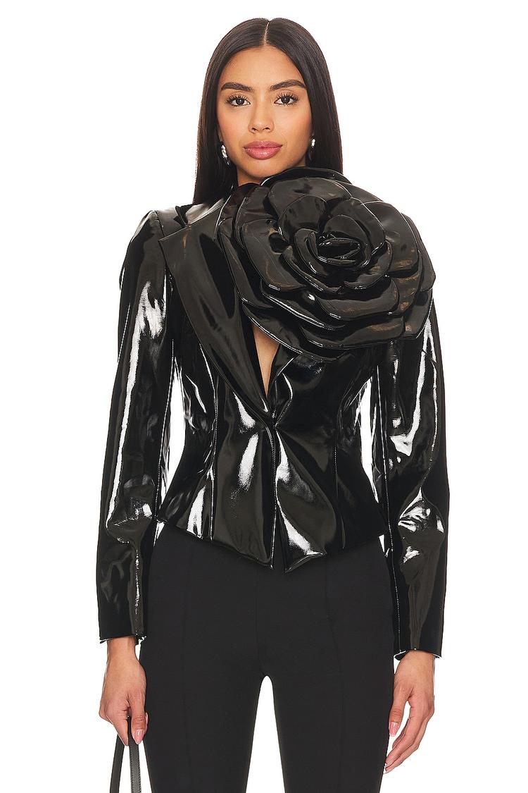 This avant-garde single-breasted blazer features a fitted silhouette and waist-length cut crafted from high-shine vinyl polyester fabric. Lightly padded shoulders and notched lapels add classic tailoring, while a tonal, oversized statement rosette ruffle detail adorns one shoulder, creating a striking focal point. The blazer closes with a single front button and has long regular sleeves. Perfect for cocktail events, night outs, or casual chic occasions, this piece blends edgy texture with elegant design, offering a modern take on formal outerwear with its glossy finish and sculptural embellishment.