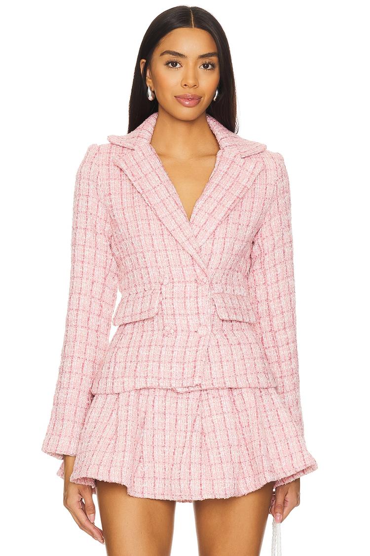 This pink tweed double-breasted blazer features a fitted silhouette with hip-length coverage, perfect for spring and autumn wear. Crafted from polyester with a classic notch lapel collar and long regular sleeves, it offers a sophisticated and chic look. The blazer showcases padded shoulders for structure and faux buttoned cuffs, while the checkered pattern runs all over the fabric. Front flap pockets add both style and function. Ideal for workwear, business casual settings, or a stylish brunch, this blazer embodies timeless elegance with modern tailoring.