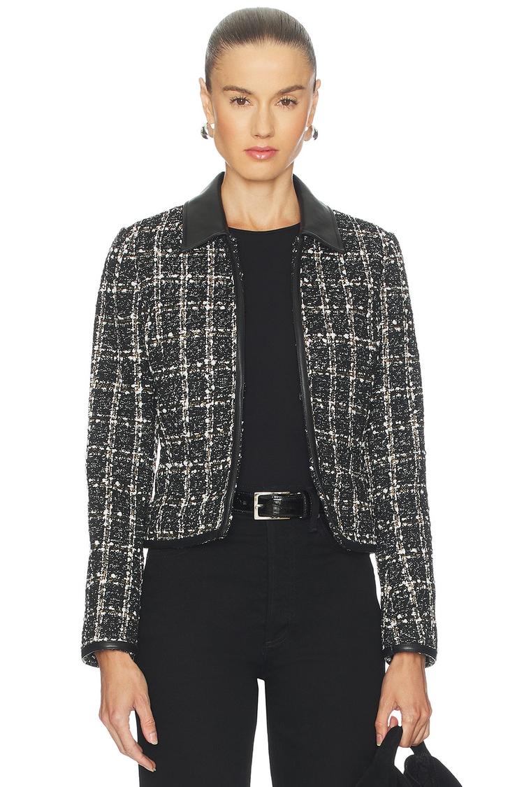 This Eloise blazer features a fitted, waist-length silhouette crafted from midweight tweed fabric with a classic black, white, and gray checkered pattern. It has a lapel collar and long regular sleeves, accented with a faux leather collar and trim adding subtle sophistication. The blazer closes with front hook and eye fastenings and includes front faux pockets for style and function. Fully lined with viscose and polyester, it is ideal for business casual, workwear, or conference occasions during autumn, winter, and spring seasons.