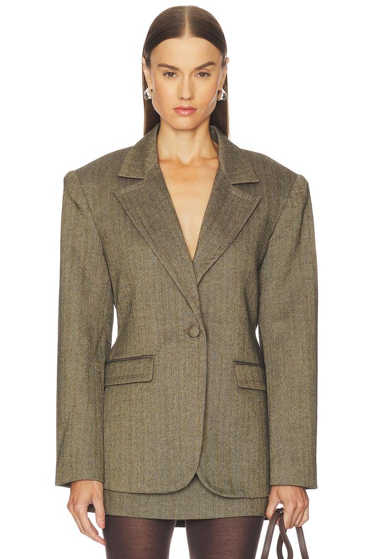 This tailored single-breasted blazer features a muted olive herringbone fabric that brings timeless sophistication to your wardrobe. With a classic notch lapel collar, long regular sleeves, and hip-length cut, it offers a polished silhouette enhanced by shoulder pads and an adjustable buckle at the back for a custom fit. Crafted from a polyester-wool-rayon blend with a viscose-polyester lining, the blazer includes dual flap pockets for functionality. Ideal for workwear, business casual, and conference settings, this matte-finish blazer embodies minimalist elegance and refined style.