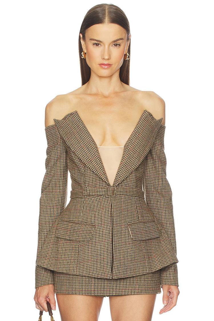 This tailored single-breasted blazer features an off-shoulder neckline and long sleeves, creating a chic and sophisticated silhouette. Crafted from a midweight tweed fabric blend of polyester, wool, and viscose, it offers warmth and texture with a classic checkered pattern all over. The hip-length blazer is finished with a detachable waist belt that cinches the waist for an adjustable fit, front faux pockets, and a visible back zipper closure. Ideal for business casual, workwear, or brunch, this blazer combines timeless style with modern details for versatile seasonal wear.