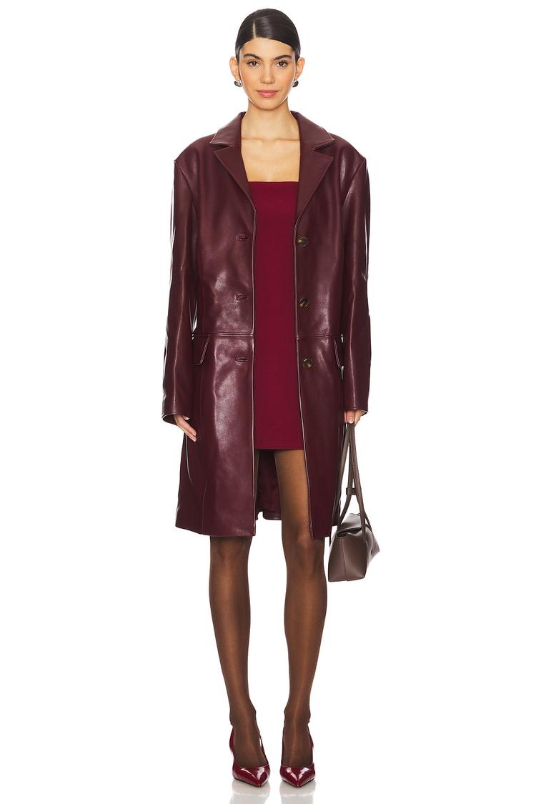 This tailored single-breasted leather blazer in a rich matte dark burgundy hue features classic lapels and long regular sleeves, falling to a knee length for a sophisticated silhouette. Crafted from genuine leather with a front button closure and side flap pockets, it embodies timeless elegance with a chic, polished finish. Ideal for autumn, winter, and spring wear, this blazer suits casual outings, workwear, and business casual settings, offering a sleek and structured look with practical pocket functionality.
