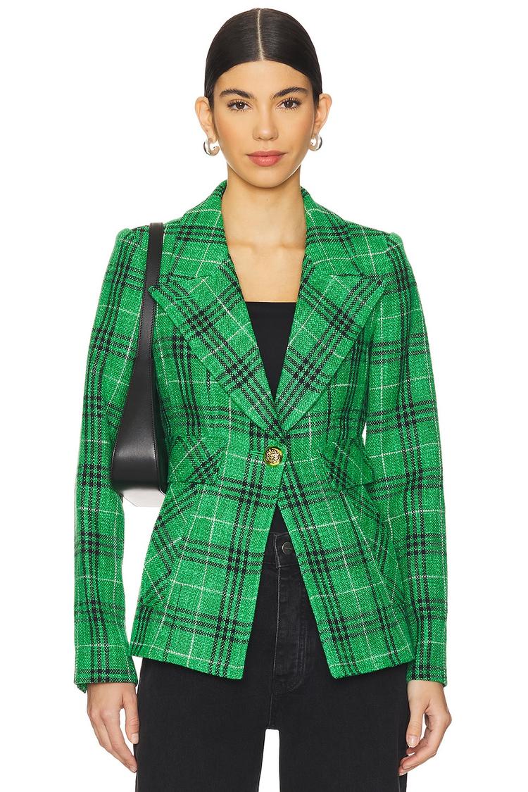This tailored single-breasted blazer features a vibrant bright green plaid pattern woven in heavyweight twill linen fabric, perfect for spring and autumn wear. The hip-length silhouette is accentuated with a notched lapel collar and long regular sleeves, creating a sophisticated and classic look. Padded shoulders with gold-tone epaulettes add structure and elegance, while front faux flap pockets provide practical functionality. The blazer is fully lined with acetate and cupro for comfort and smooth layering, secured by a front gold button closure. Ideal for workwear, business casual, or conferences, this piece blends timeless style with refined detailing.