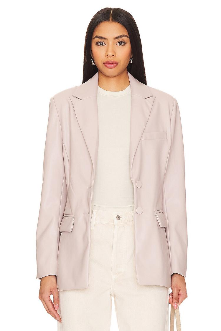 This Steve Madden Aria Faux Leather blazer features a tailored, single-breasted silhouette with a hip-length cut, perfect for spring and autumn wear. Crafted from lightweight faux leather with a matte finish, it includes a notch lapel collar, long regular sleeves, and padded shoulders for structure. The blazer fastens with front buttons and has practical front flap pockets. Fully lined in polyester, it offers a polished, minimalist style suitable for casual, workwear, and business casual occasions. Its soft light blush pink hue adds a subtle feminine touch to any outfit.