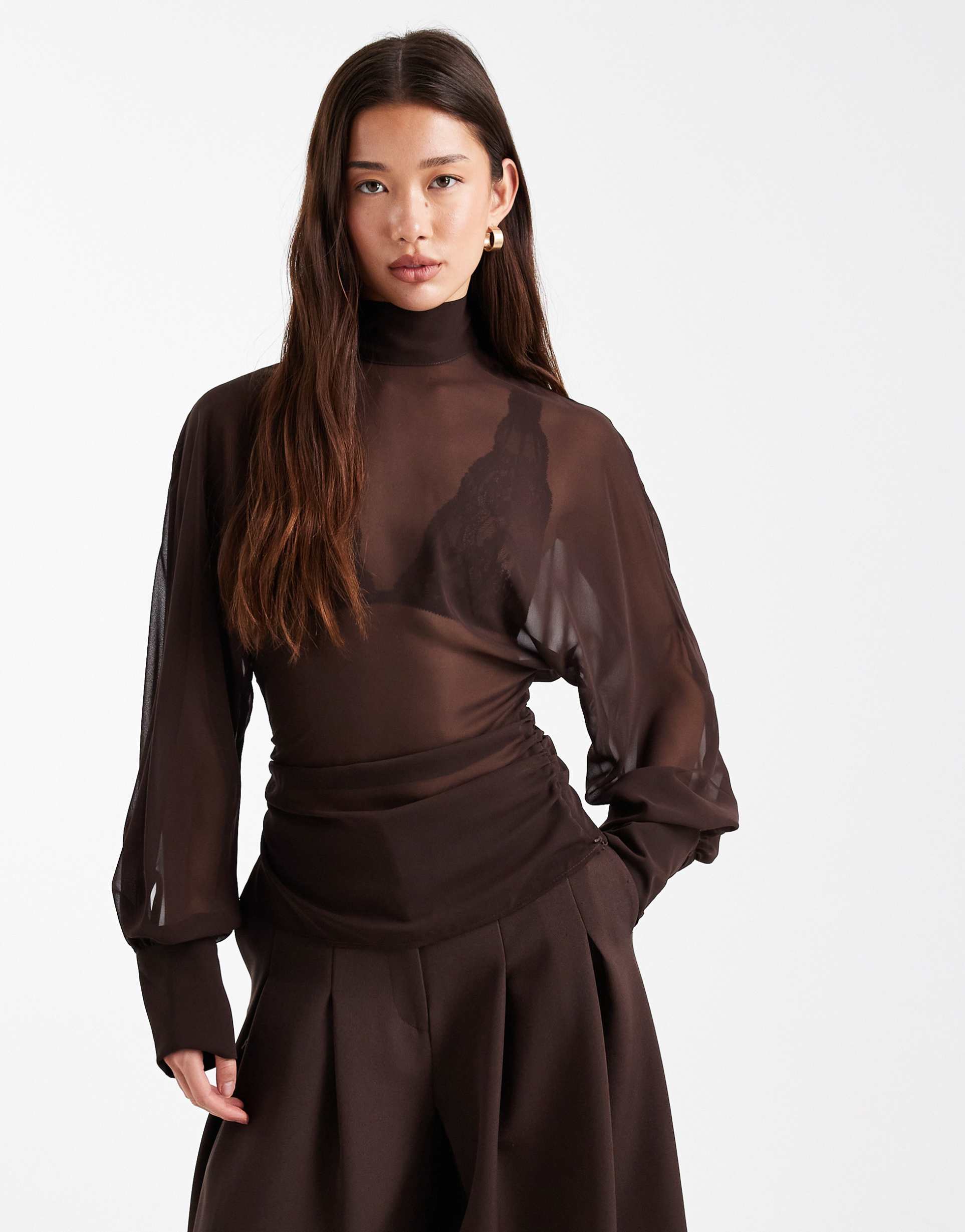 ASOS DESIGN BATWING HIGH NECK BLOUSE IN CHOCOLATE
