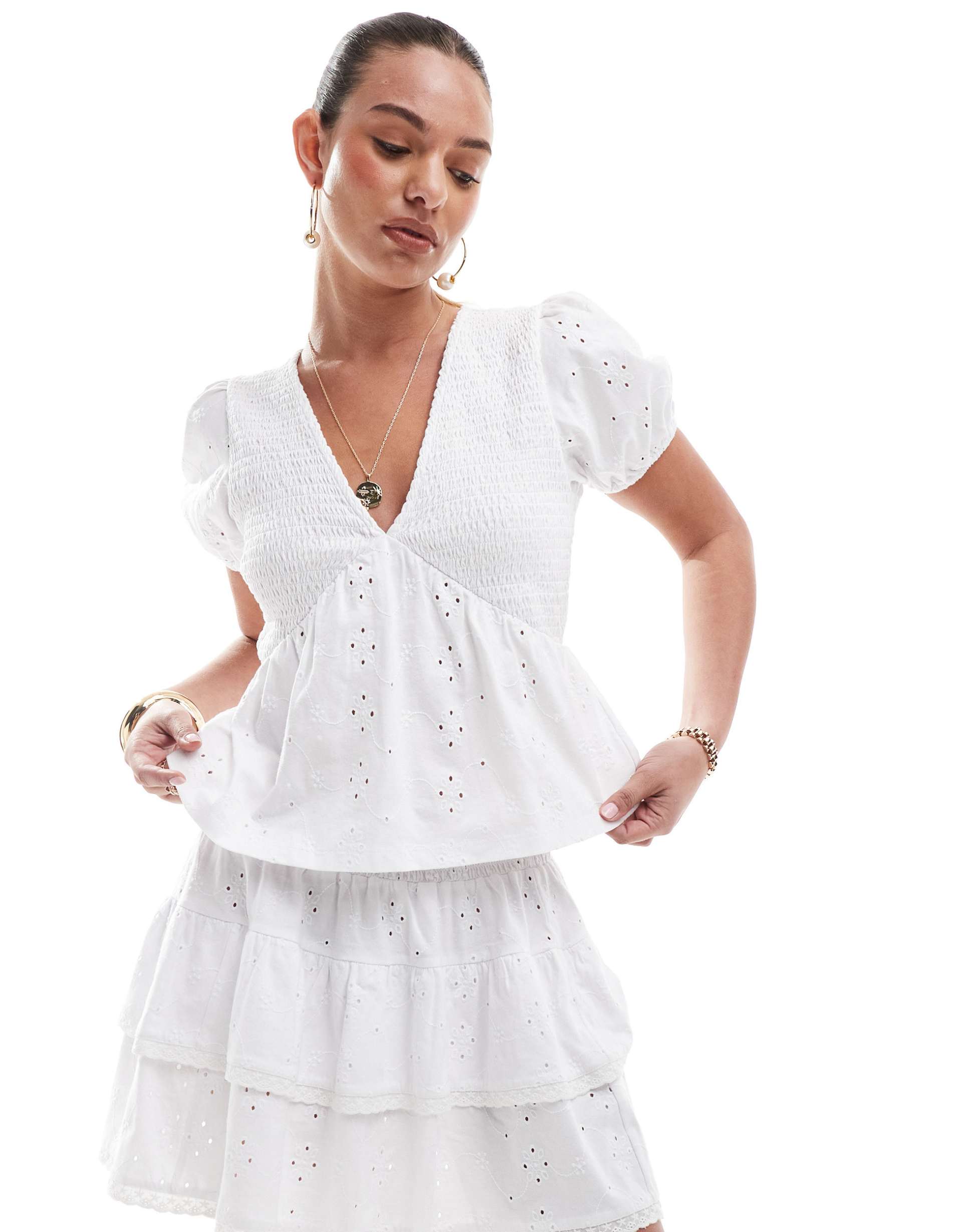 ASOS DESIGN BRODERIE V NECK BLOUSE WITH SHIRRING DETAIL IN WHITE