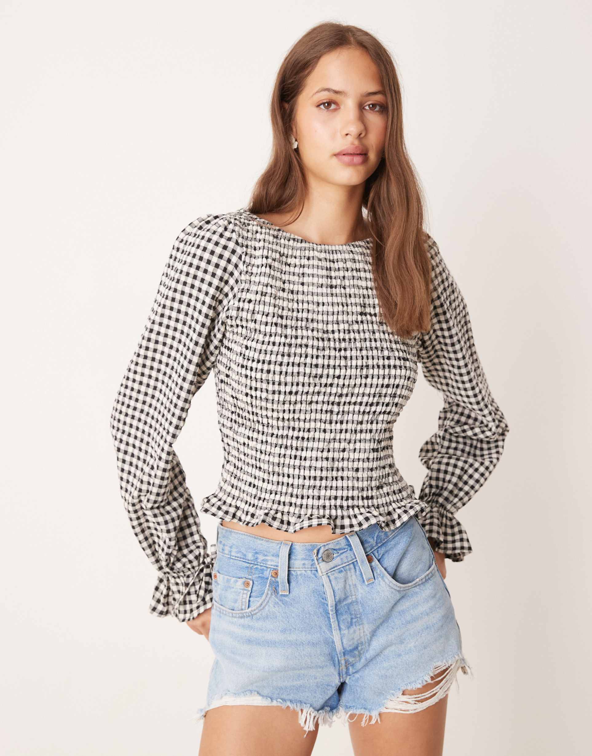 ASOS DESIGN COTTON SHIRRED BLOUSE IN MONO GINGHAM