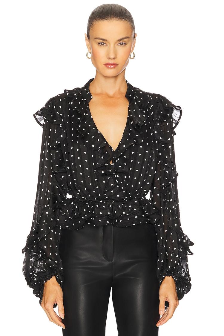 Soft chiffon fabric with delicate ruffle details and a flattering V-neckline define this black polka dot blouson blouse. The lightweight, sheer material and relaxed fit create an elegant silhouette, while the snap button closure adds subtle convenience. Finished with long ruffled sleeves and a waist-length hem, this blouse blends classic charm with romantic flair, making it ideal for casual days, brunch dates, or evening outings. Embrace a chic, feminine style perfect for spring through autumn seasons.