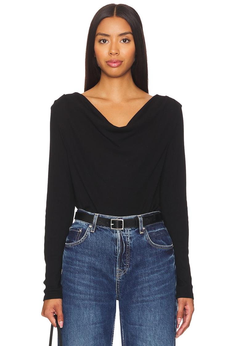 Soft rib knit fabric and a graceful cowl neckline with subtle ruffle detailing define this classic long sleeve shell. Designed with a regular fit and hip-length hem, this black pullover blouse blends comfort and elegance effortlessly. Crafted from a cotton-modal-spandex blend, it offers breathable stretch ideal for all weather. Versatile for casual days, workwear, and business casual settings, this minimalist piece is a chic essential for a polished, everyday look.