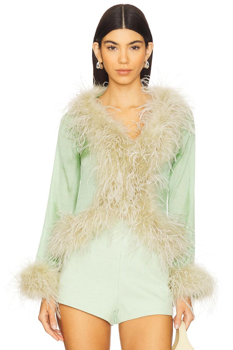 Soft pastel green silk blend fabric and a fitted silhouette define this elegant blouson blouse, featuring long sleeves and a flattering V-neckline. The standout feather trim in beige beautifully accents the collar, cuffs, front, and hem, adding a luxurious texture and sophisticated detail. Perfectly suited for cocktail parties, night outs, and festive occasions during autumn and winter, this blouse elevates any ensemble with its chic charm and refined style.