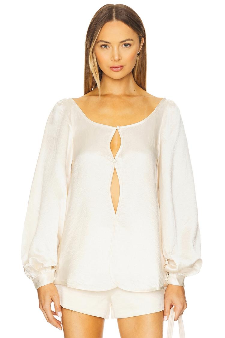 Soft cream silk with a loose, blouson silhouette and elegant balloon sleeves creates a refined yet relaxed look. The blouse features a round neckline and two keyhole cutouts with hook closures on the front, adding subtle allure. Its hip-length hem and flowing fit make it an ideal choice for casual outings, brunches, or romantic date nights. This minimalist and chic silk blouse offers luxurious comfort and understated style, perfect for spring through autumn wardrobes.
